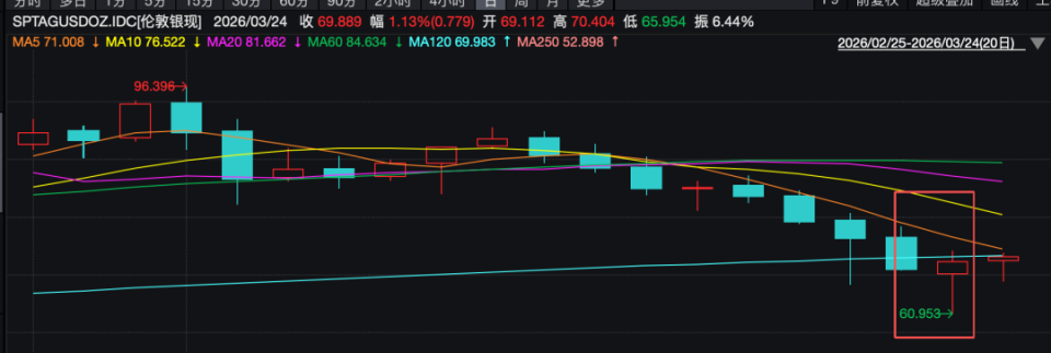祈福生活服務公告當天(3月23日),現貨黃金盤中跌超8%,一度失守4100美元/盎司;現貨白銀盤中一度跌逾10%,逼近60美元/盎司,金銀盤中均創年內新低,抄底“值博率”較高。