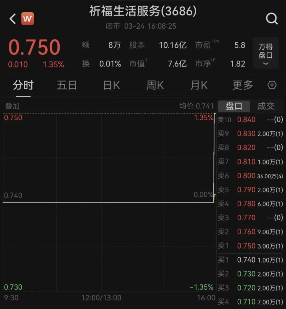 二級市場上,截至3月24日收盤,祈福生活服務尾盤直線拉升,報收0.75港元,最新市值為7.6億港元。