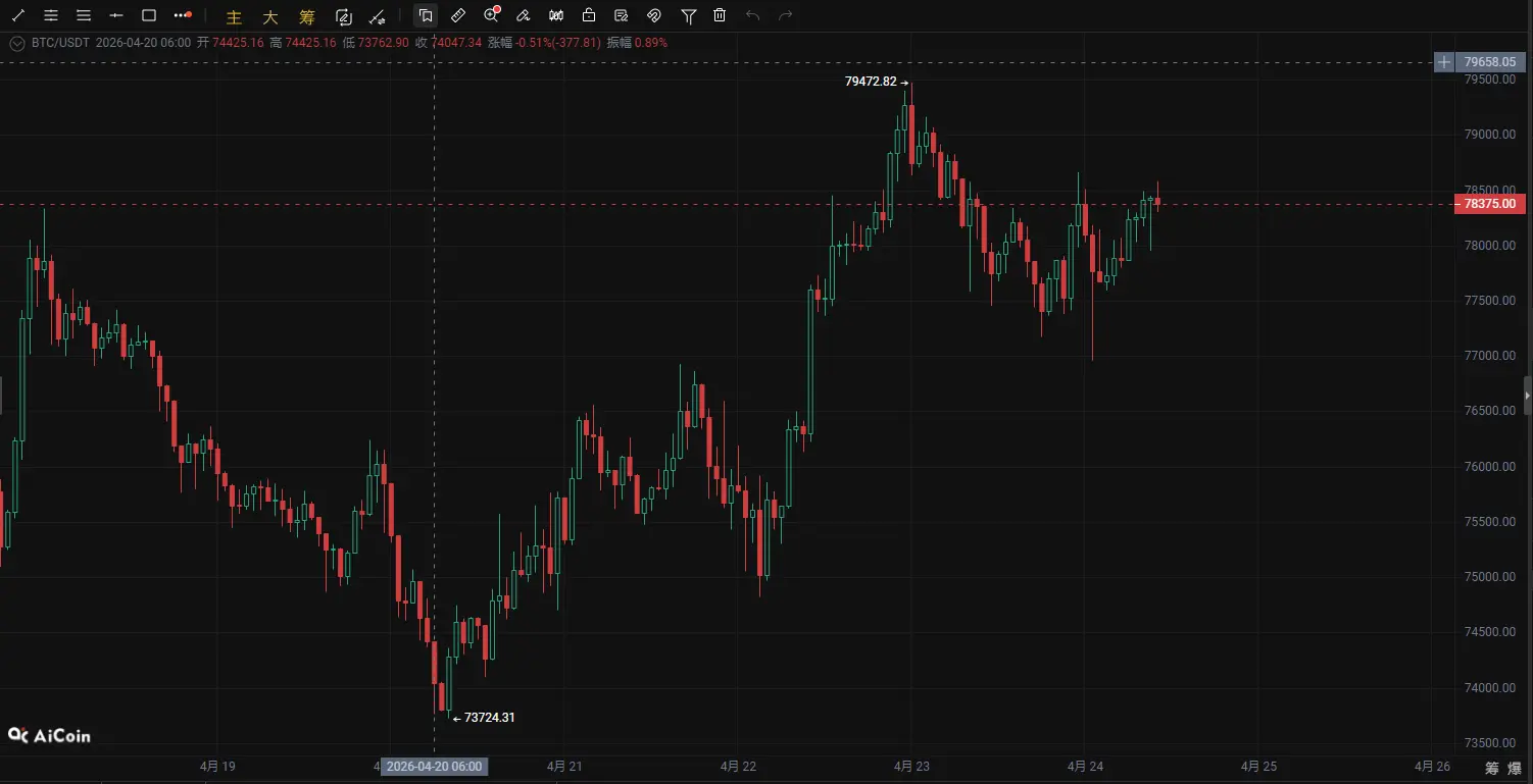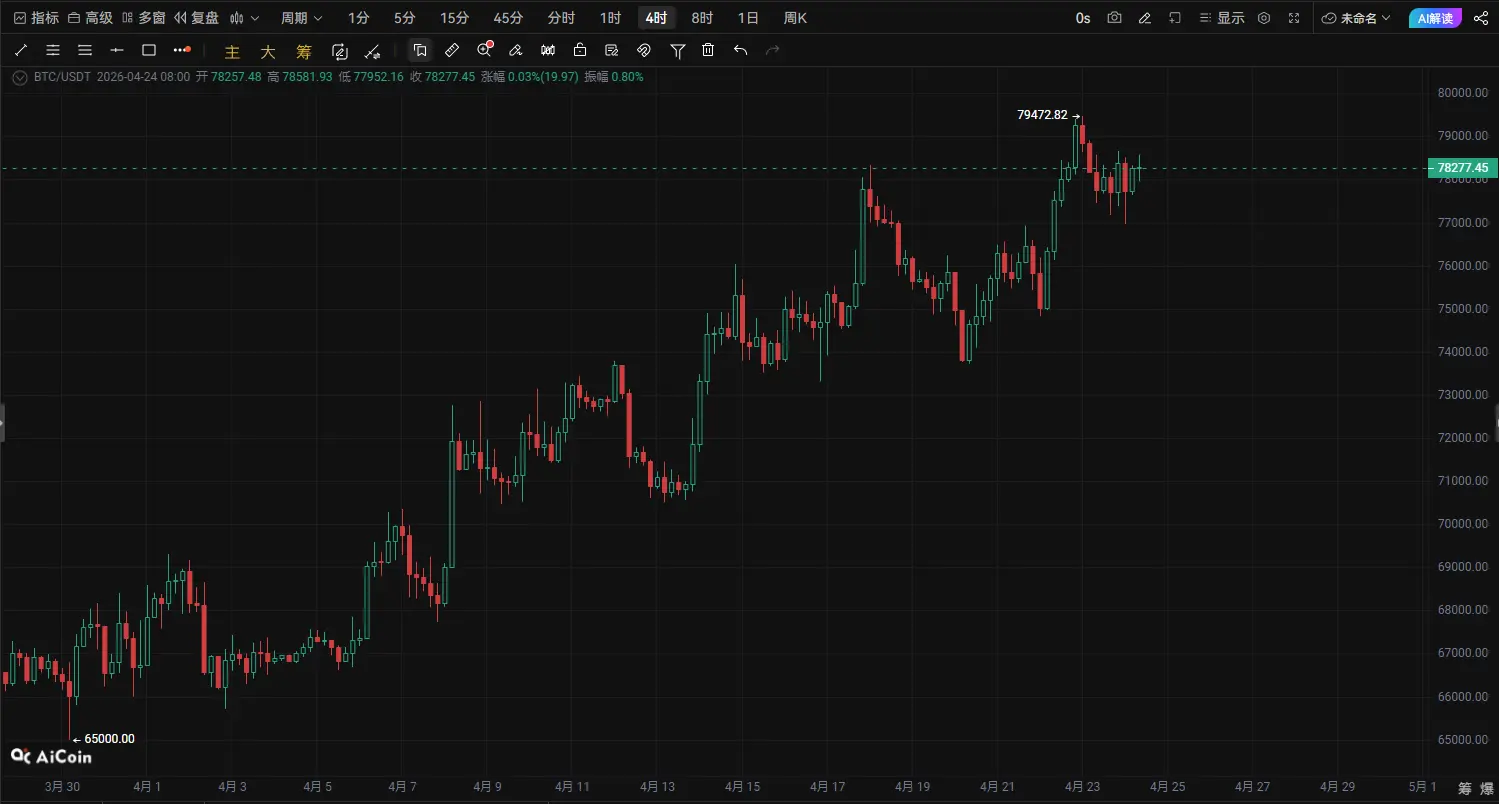 截至 4月24日,Bitcoin(BTC) 当前价格 78,262 USDT。从当前K线结构来看,比特币在连续反弹后已经进入 短线高位震荡区域。虽然整体中期趋势仍偏向反弹修复,但从 1小时与4小时周期来看,多头动能开始明显减弱,短线存在 技术性回踩需求。