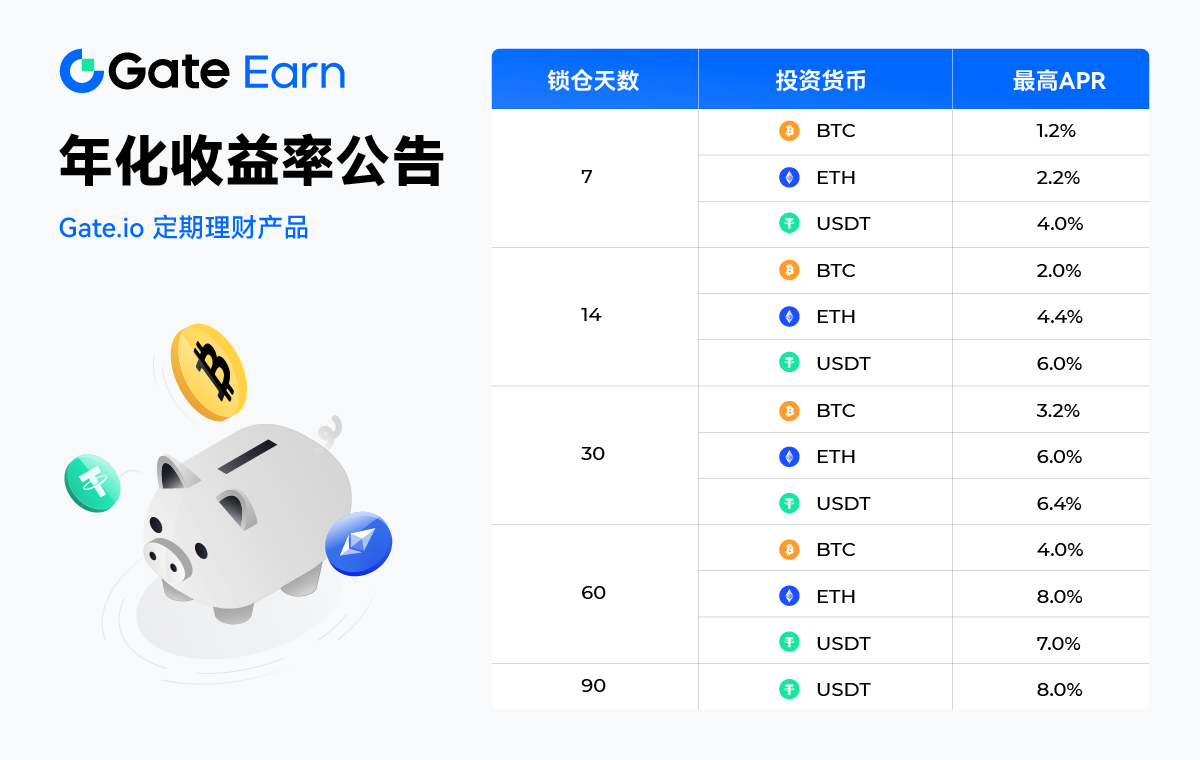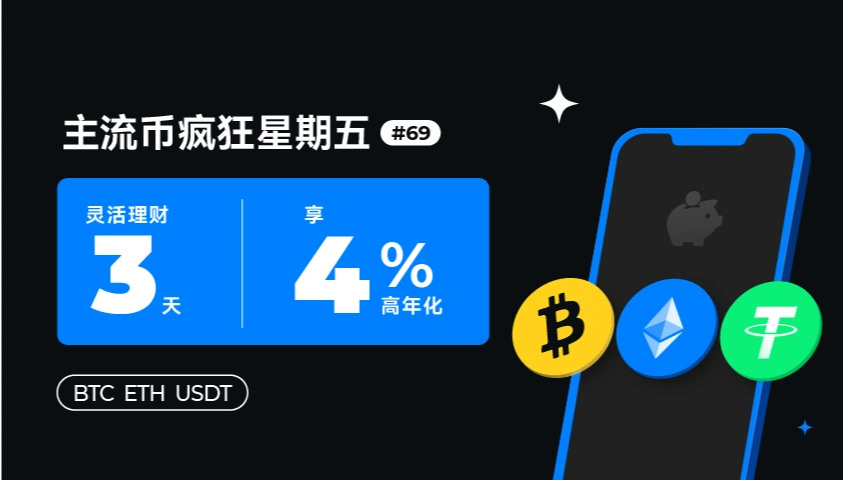 Gate理財寶每週五上線「主流幣瘋狂星期五」活動,新舊用戶一鍵參與即可享受主流幣定期理財短期高年化福利。本期(第69期)活動幣有BTC/ETH/USDT,理財週期短至3天收益率高達4% !認購額度有限,先到先得!