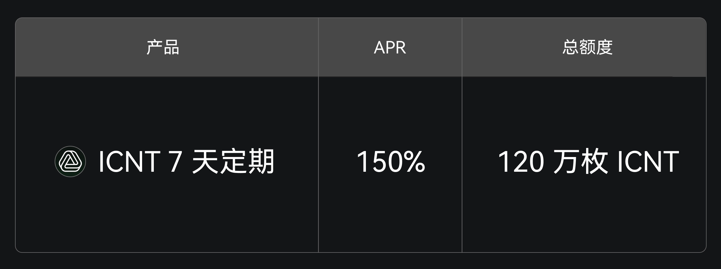 Gate 余币宝现已上线 ICNT 7 天定期理财,年化收益 150%,总额度 120 万枚 ICNT,限量发售,先到先得。