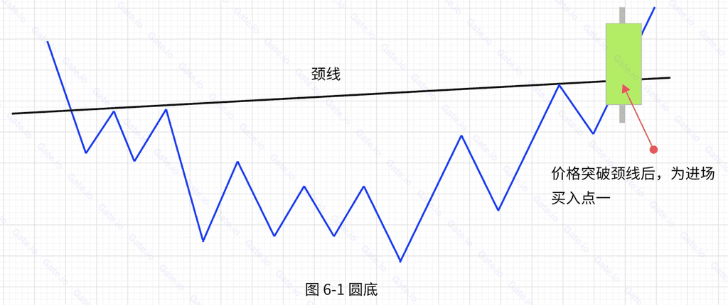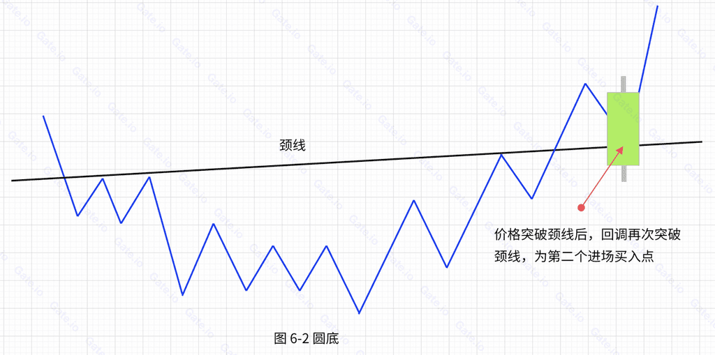 2、圆底进场买入点二:当价格突破圆底颈线后,激进买入者进场,此时价格通常会回落,当再次站稳颈线后,为进场买入点二,如下图所示: