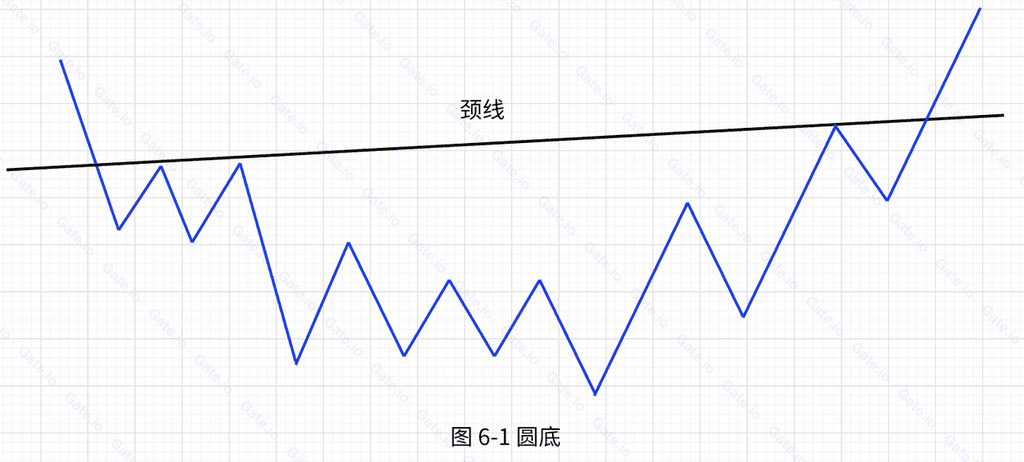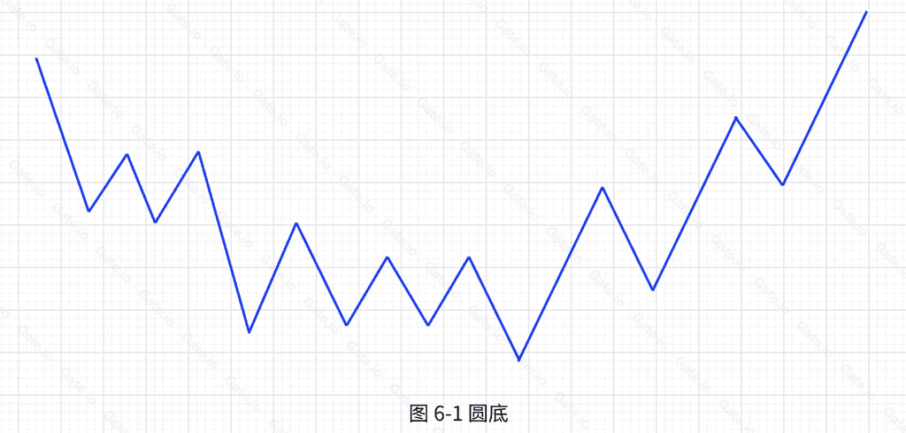 圆底,是指价格在下跌过程中跌速越来越慢,成交量也越来越萎缩,然后币价停止下跌,在底部横盘一段时间后开始缓慢回升,涨速越来越快,成交量也随着币价的上涨而逐步放大。因为其形状呈圆弧形,所以称为圆底。如图6-1所示: