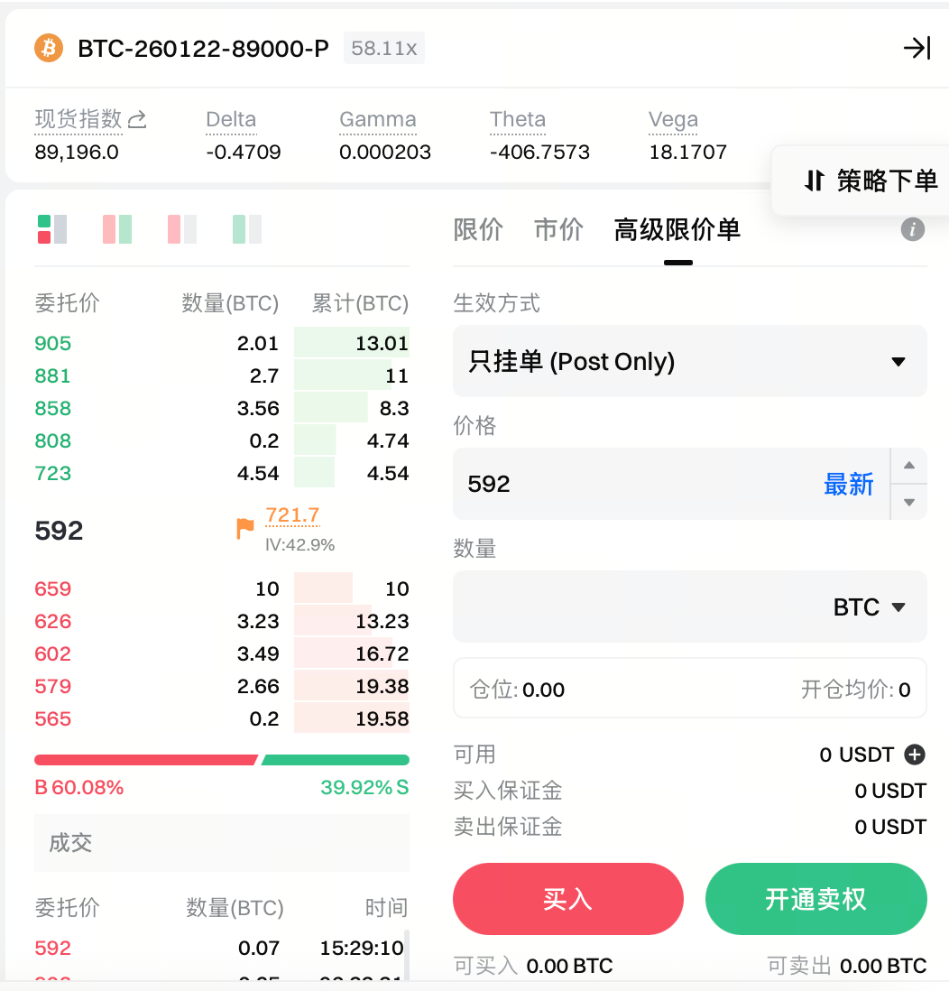 下面是 Gate 的下单界面,选择一个期权合约后的期权标识展示如下: