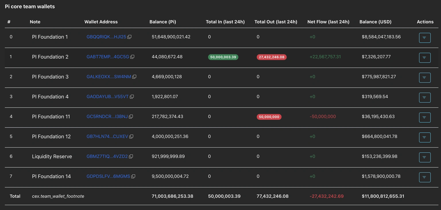 Pi Network核心团队的钱包持有超过710亿枚PI代币,其中2,700万枚在过去24小时内被移除,这很可能加剧了当前的抛售潮。 这2,700万枚代币是从一笔更大的5,000万枚PI代币转移至核心团队钱包的计划中策略性地提取出来的,这降低了人们对Pi基金会的信心。 Pi基金会钱包的持续资金外流可能导致PI价格出现更大幅度的回调。