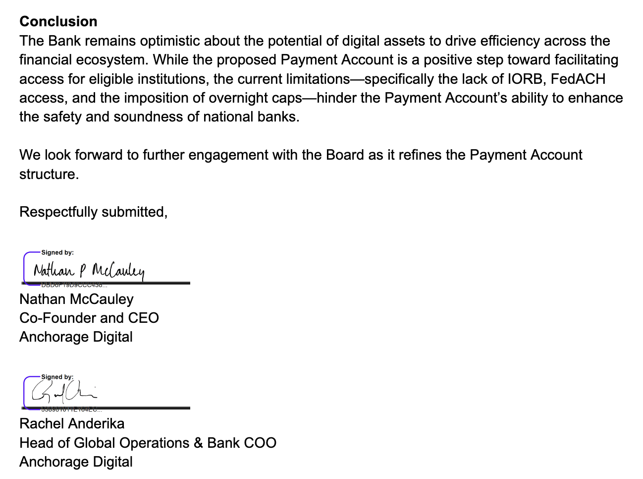 美国首家获得联邦特许执照的加密银行 Anchorage Digital Bank 于 2026 年 2 月 6 日提交评论,**指出虽然支持联准会的创新举措,但现有的资金上限设置极其不合理。**Anchorage 指出,这种上限限制会迫使机构在夜间必须将客户资金转移至代理银行,这不仅重新引入了原本想要消除的信用风险与营运风险,更会让支付账户在业务连续性与灾难恢复方面的价值消失殆尽。因此,该银行主张撤销或大幅提高上限,是维持结算系统稳定性的必要条件。