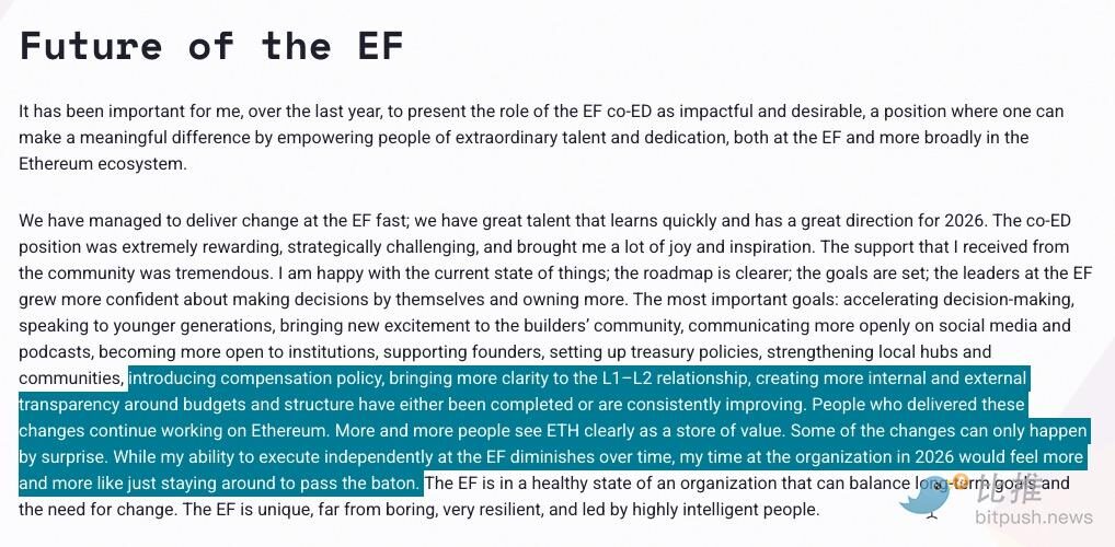 第三,也是最值得玩味的一句:“基金会的领导层越来越有信心自己做决定、自己掌控更多事务。随着时间的推移,我在基金会独立执行的能力在减弱。如果继续待下去,2026 年我更多只是在‘等着交棒’。”