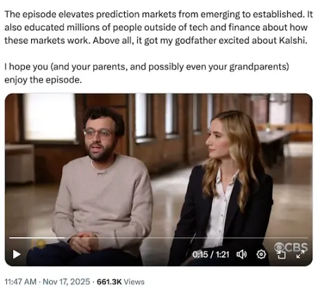 Kalshi 团队参与 CBS《周日早晨》节目视、谈 Kalshi 预测市场业务的访谈片段截图