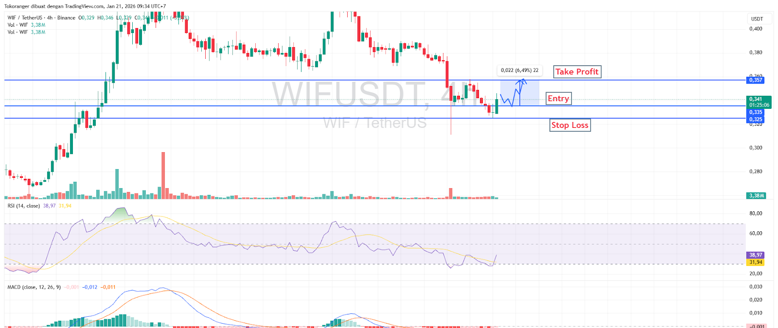 WIF/USDT (4小时图)目前开始出现短期反转迹象。此前出现的十字星蜡烛暗示市场犹豫,价格可能继续小幅突破,伴随看涨蜡烛。成交量虽不及上周,但今日已有增加,支持价格变动。