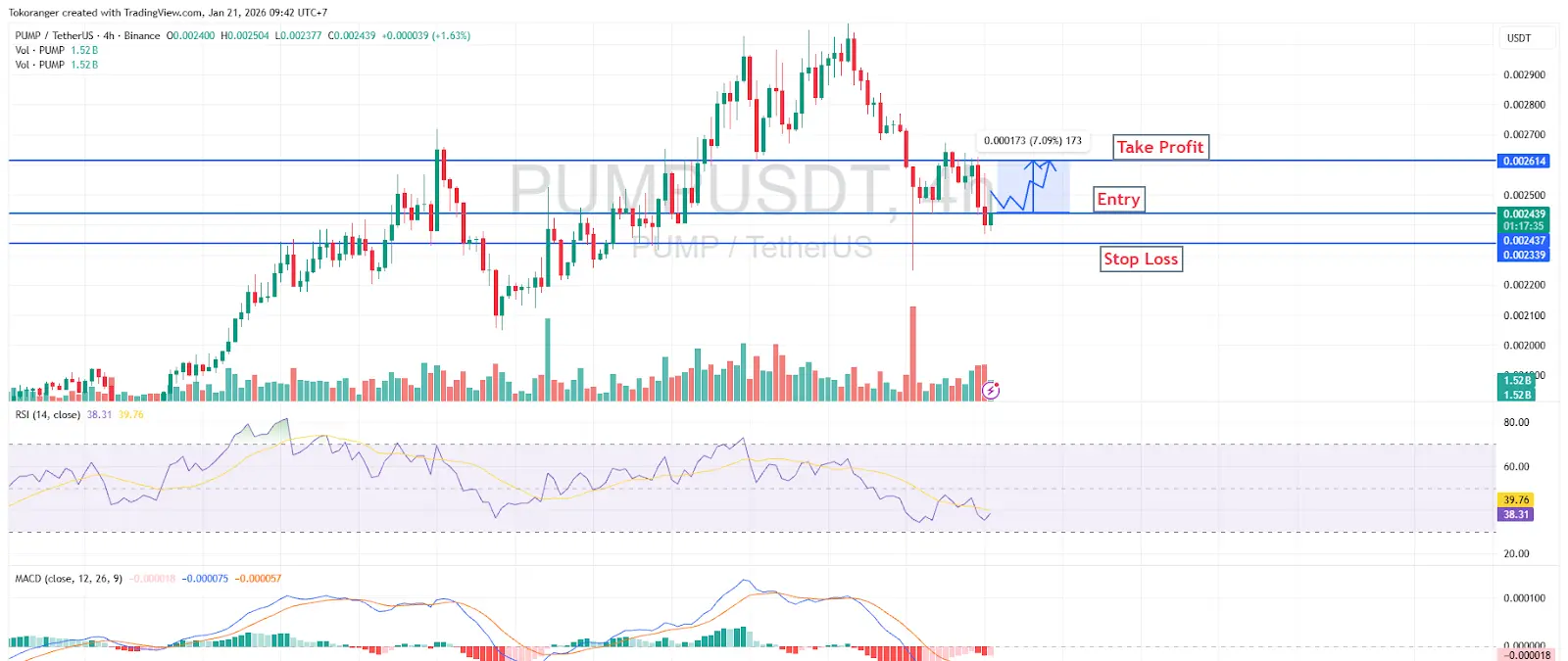 从RSI来看,已出现反转初步信号,接近金叉,但尚未确认,需继续观察数小时。此时PUMP仍属短线投机,入场点在0.002437,止损设在0.002339,止盈目标为0.002614,保持纪律,因整体趋势仍偏空。