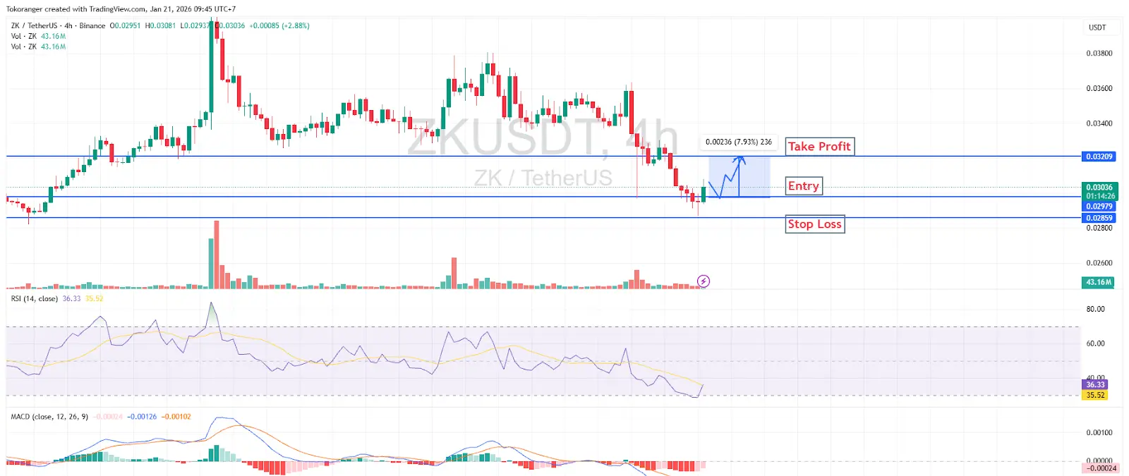 ZK/USDT (4小时图)目前仍处于下行趋势,MACD在零线以下,但开始出现短期积极信号。RSI从低位开始回升,显示卖压减轻,成交量也较高,表明买盘逐步入场。