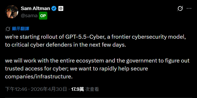 OpenAI 执行长奥特曼(Sam Altman)在今天(4/30)稍早预告,**未来几天将推出 GPT-5.5-Cyber 新一代网络安全模型,开放网络安全领域的专家们使用。**他表示团队将与生态系统及政府合作,找出可靠存取方式以确保企业与基础设施安全。