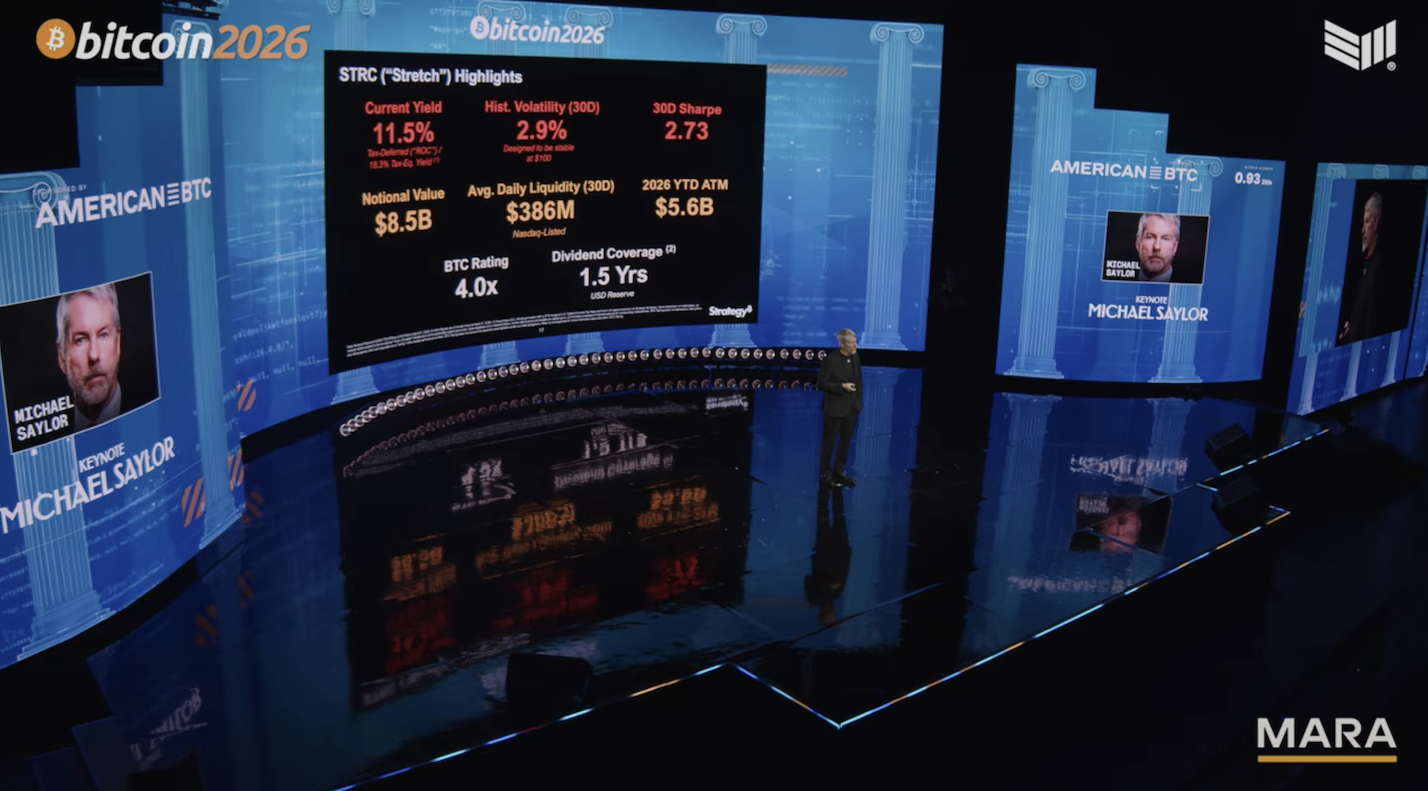 Strategy 以数字信贷为框架推出的信贷产品 STRC 成为大会焦点。这款产品自推出仅 9 个月,市值便迅速攀升至 8,5 亿美元。**STRC 目前在纳斯达克(Nasdaq)挂牌交易,提供高达 11.5% 的年化月度股息。**它是全球规模最大且流动性最强的优先股,单日流动性约 4 亿美元,交易量达到富国银行(Wells Fargo)或摩根大通(JP Morgan)等传统金融巨头优先股的 25 倍以上。
