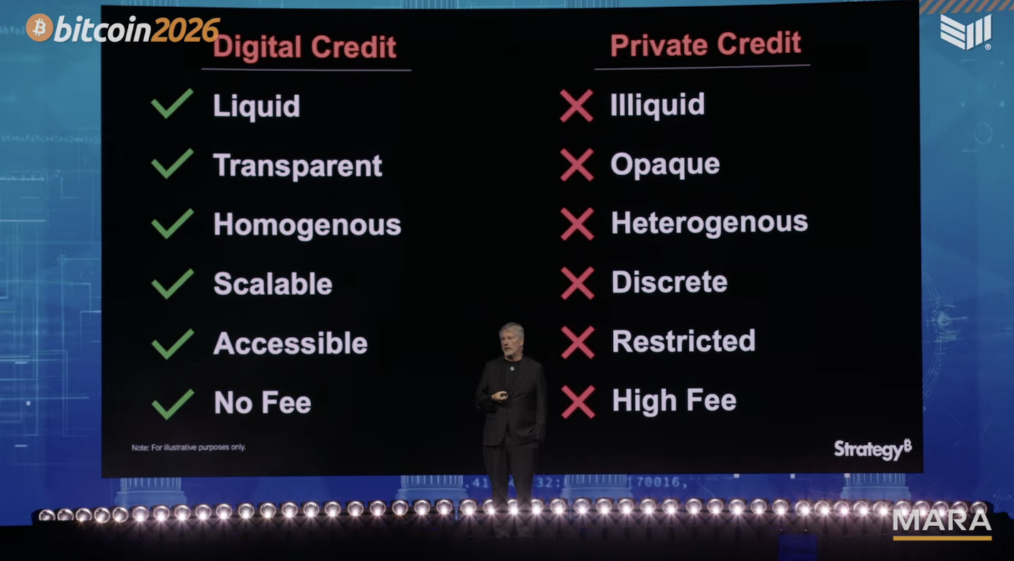 图源:Bitcoin 2026 数字信用具备透明、同质、可扩展且无费用的优点,与传统私募基金透明度低、高费用且流动性差的特性形成鲜明对比